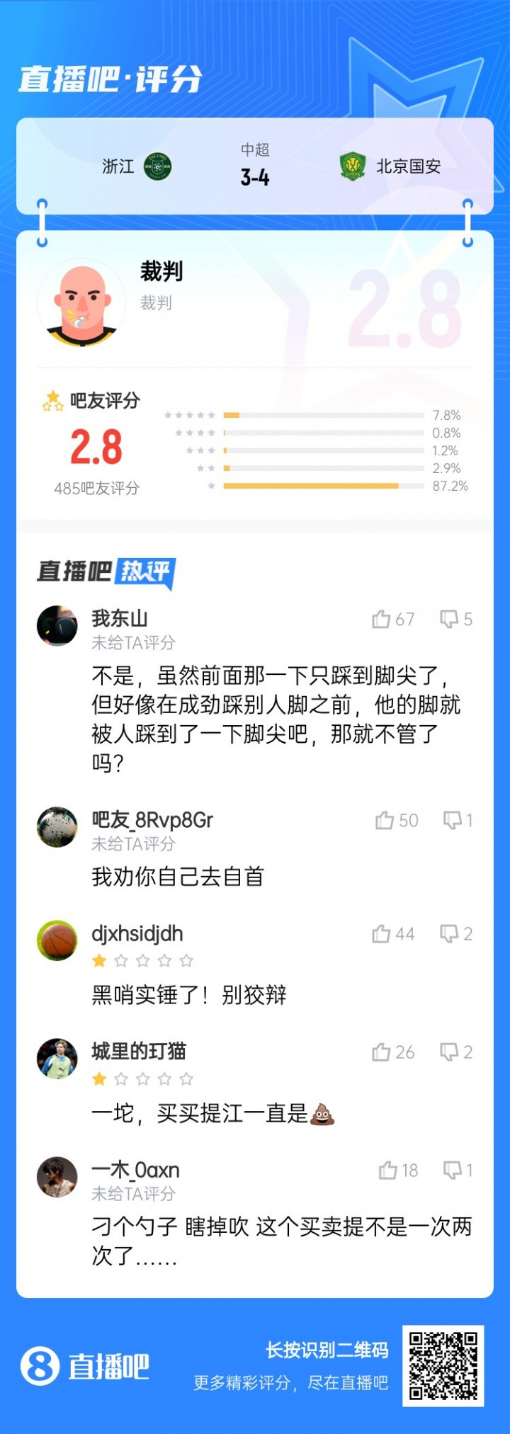 直播吧08月10日讯中超第20轮,十人浙江主场3-4不敌北京国安,本场比赛的主裁判麦麦提江仅获2.8分吧友评分。