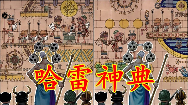 弗兰奇和里普利正站在一幅巨型的壁画面前,这幅巨型壁画是“空白一百年”期间绘制的。罗宾正在翻译萨乌罗拿给她的《哈雷神典》,这本神典中提到,这个世界曾经发生的两场古老战争,以及即将到来的第三场战争。